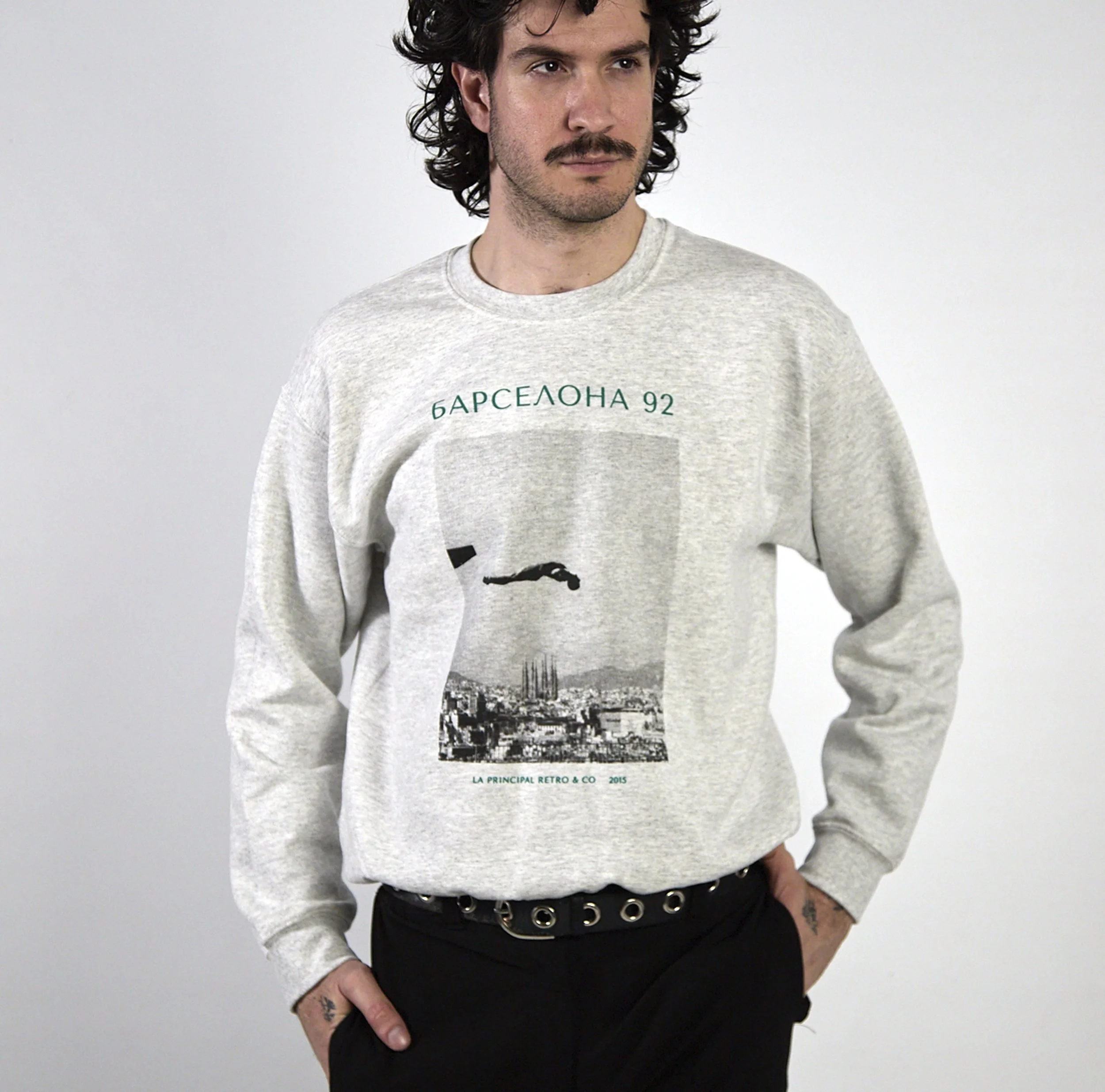 La sudadera "БАРСЕЛОНА 92 EL SALTO" captura la esencia de los Juegos Olímpicos con una fotografía icónica de un salto olímpico en una piscina de Barcelona. La tipografía en cirílico aporta un toque urbano y cosmopolita, fusionando la nostalgia olímpica con un diseño moderno y atemporal.